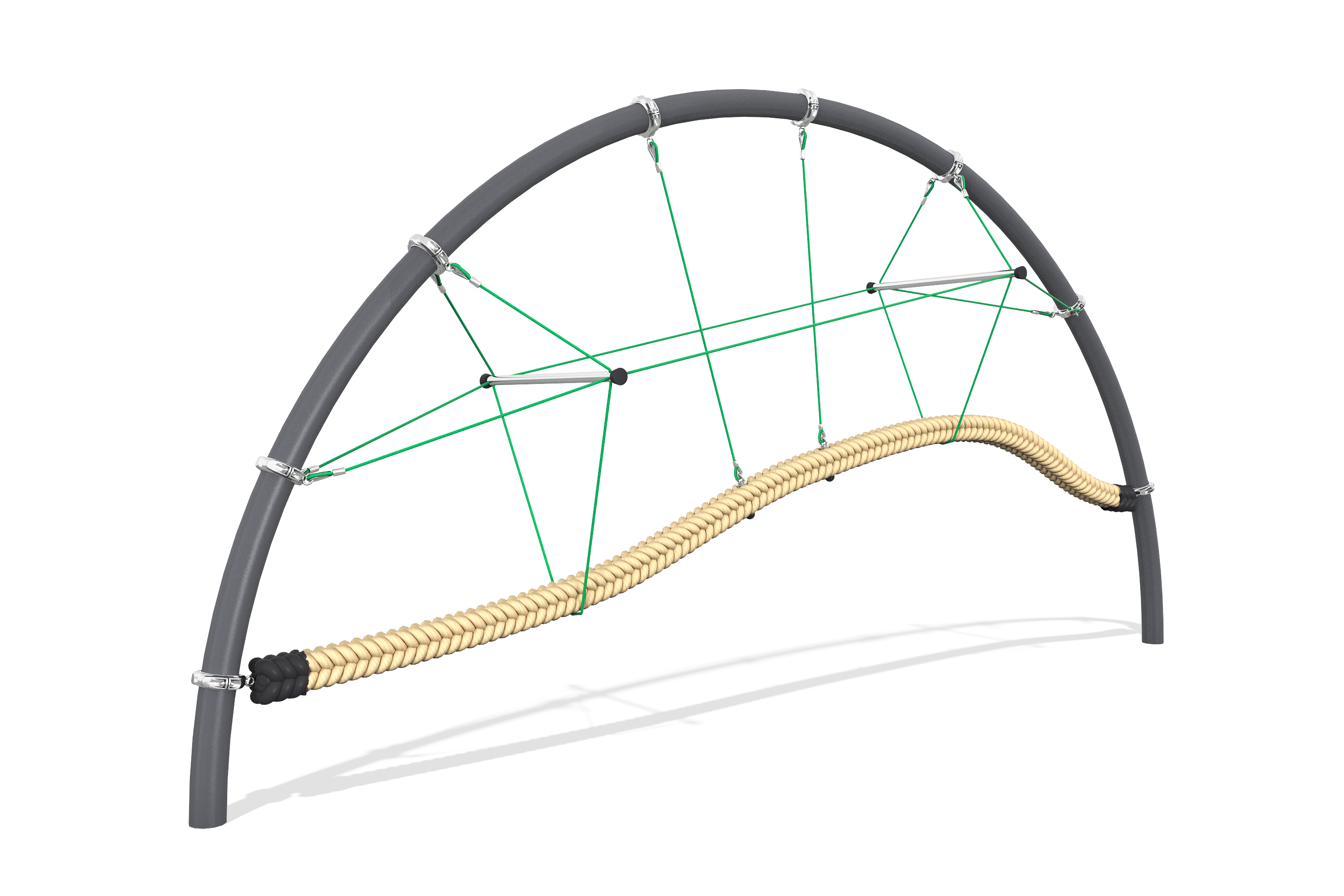 Структура комплекса устойчива и надежна благодаря опорным столбам из клееного бруса и металлическим элементам, которые обеспечивают необходимую прочность. Все детали оснащены защитным покрытием, что позволяет продлить срок службы оборудования.