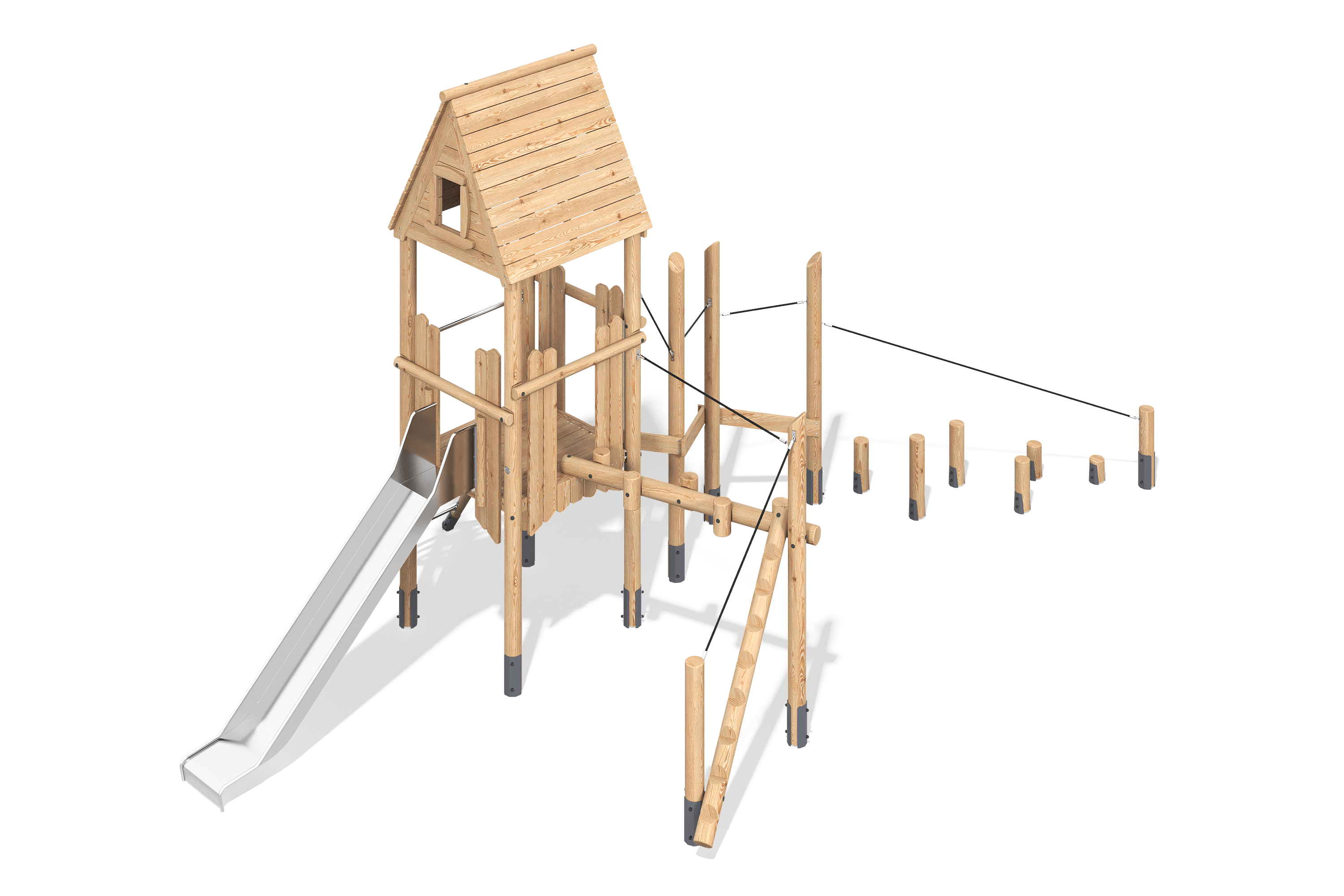 Сетка-паутина канатной части предлагает детям возможность для разнообразных игр и физической активности. Металлический опорный столб дает уверенность и стабильность, а его защитное покрытие защищает от воздействия внешней среды.