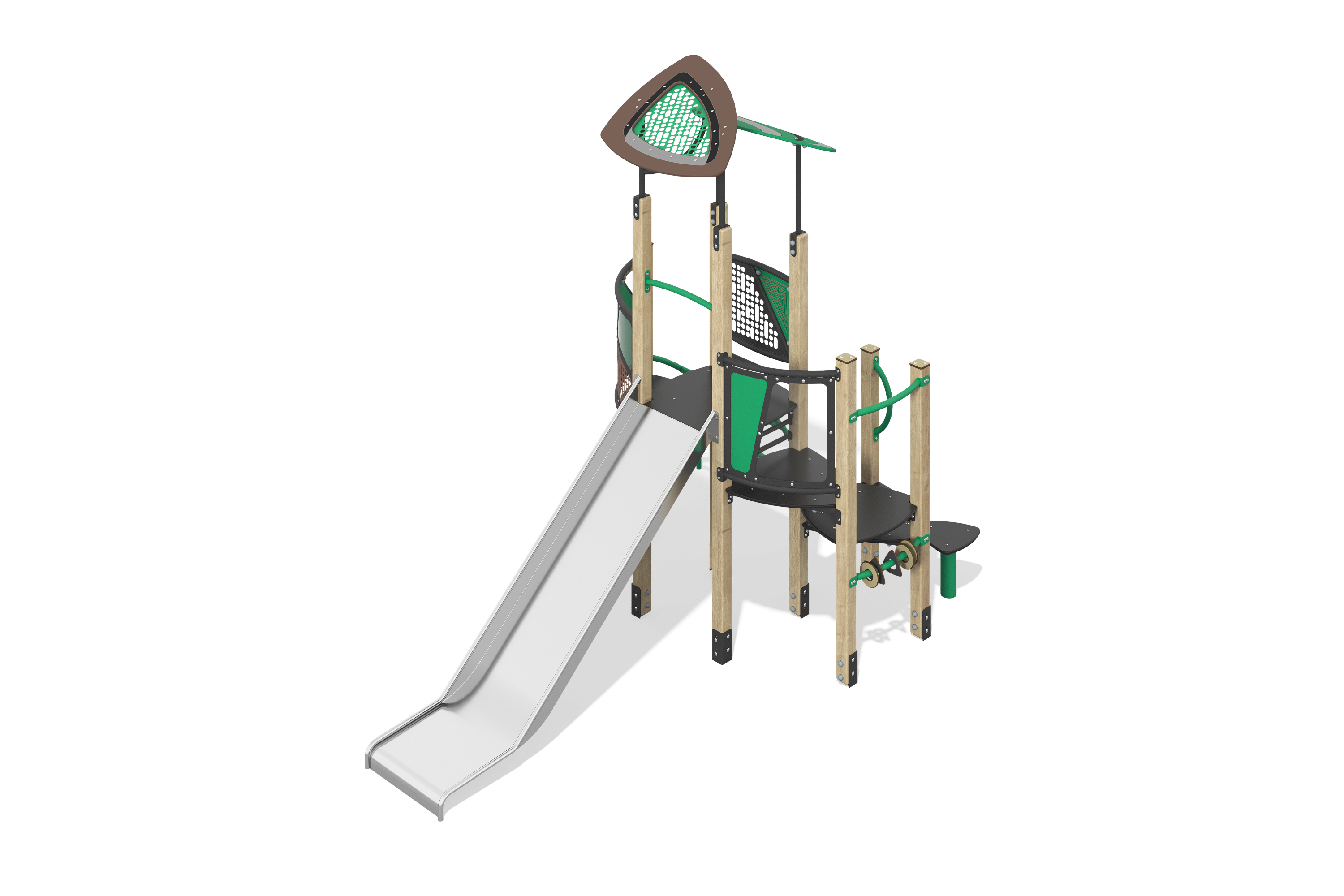 Конструкция выполнена из прочных и долговечных материалов, таких как брус и строганая доска хвойных пород, что обеспечивает надежность и устойчивость. Крыши башен покрыты HPL пластиком и монолитным поликарбонатом с ярким цветным напылением, что добавляет привлекательности.
