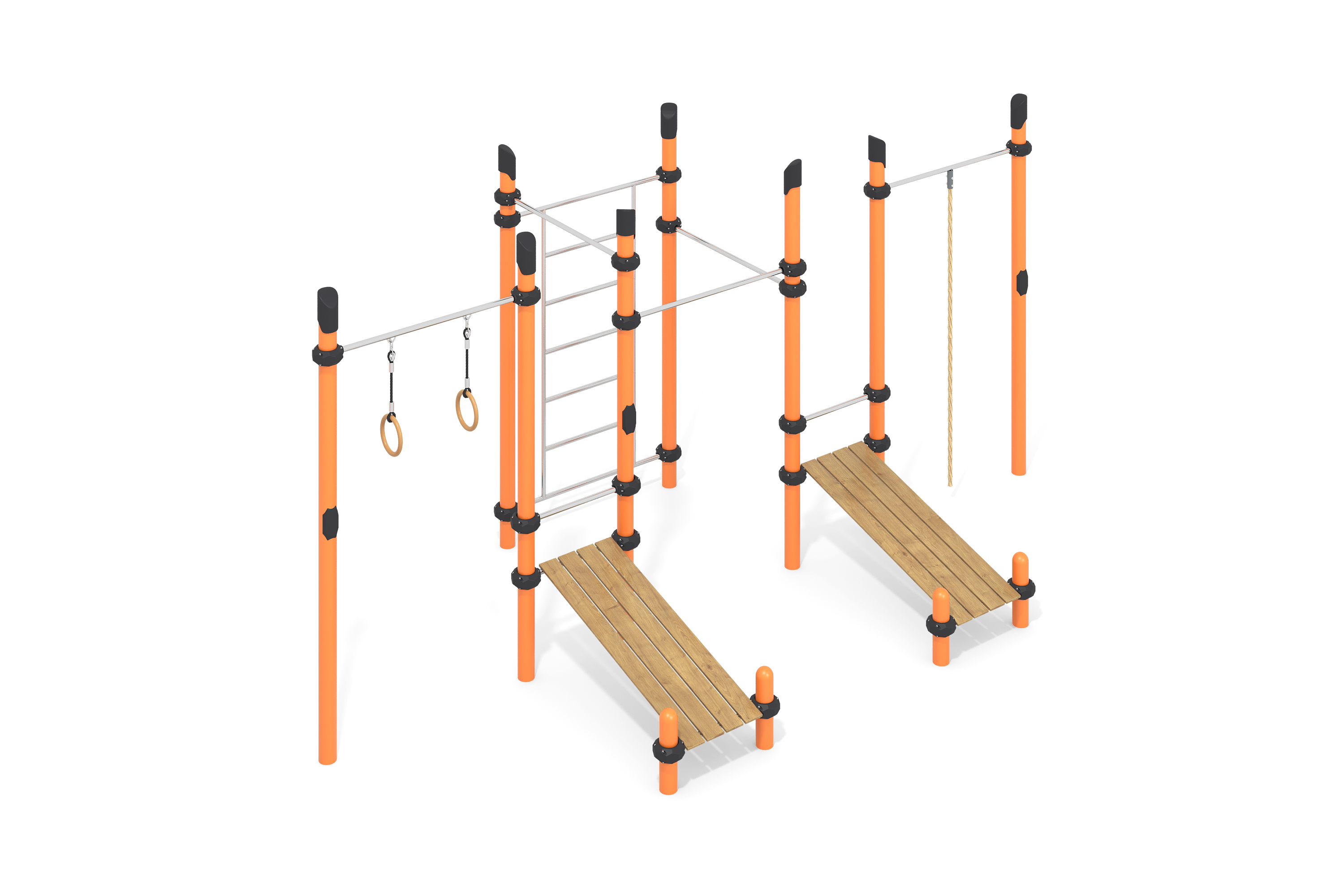 Комплекс включает вертикальные и горизонтальные лестницы, рукоход, альпинистские стенки с зацепами, а также сетку и канаты. Он предназначен для развития физических навыков, таких как сила, координация и ловкость.