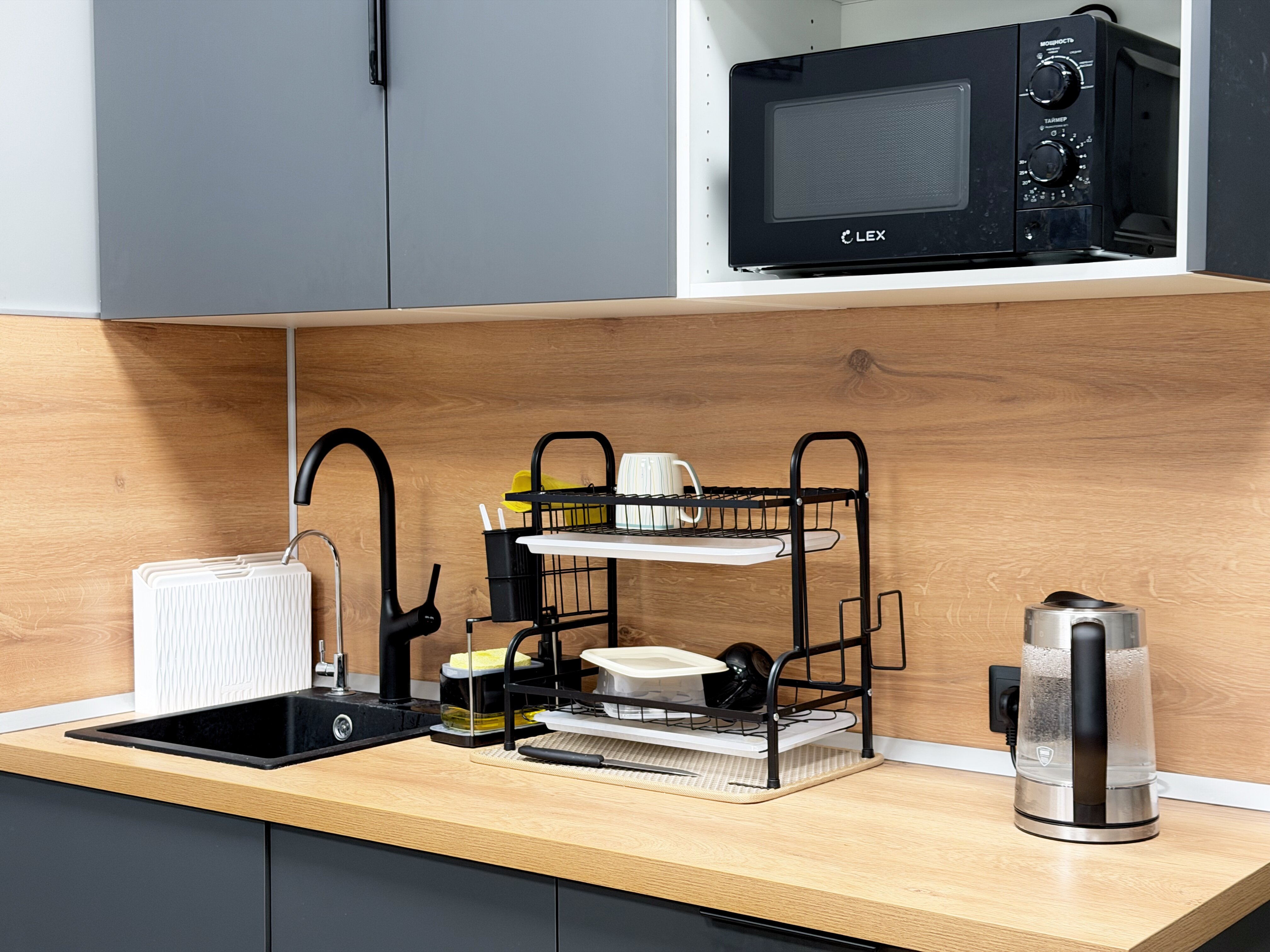 Общая гостиная оформлена как место для отдыха и общения: мягкая мебель, настольные игры, нейтральные оттенки и тёплый свет формируют домашнюю атмосферу. На кухне есть всё необходимое — плита, микроволновая печь, чайник, просторные рабочие поверхности и удобные сушилки для посуды.