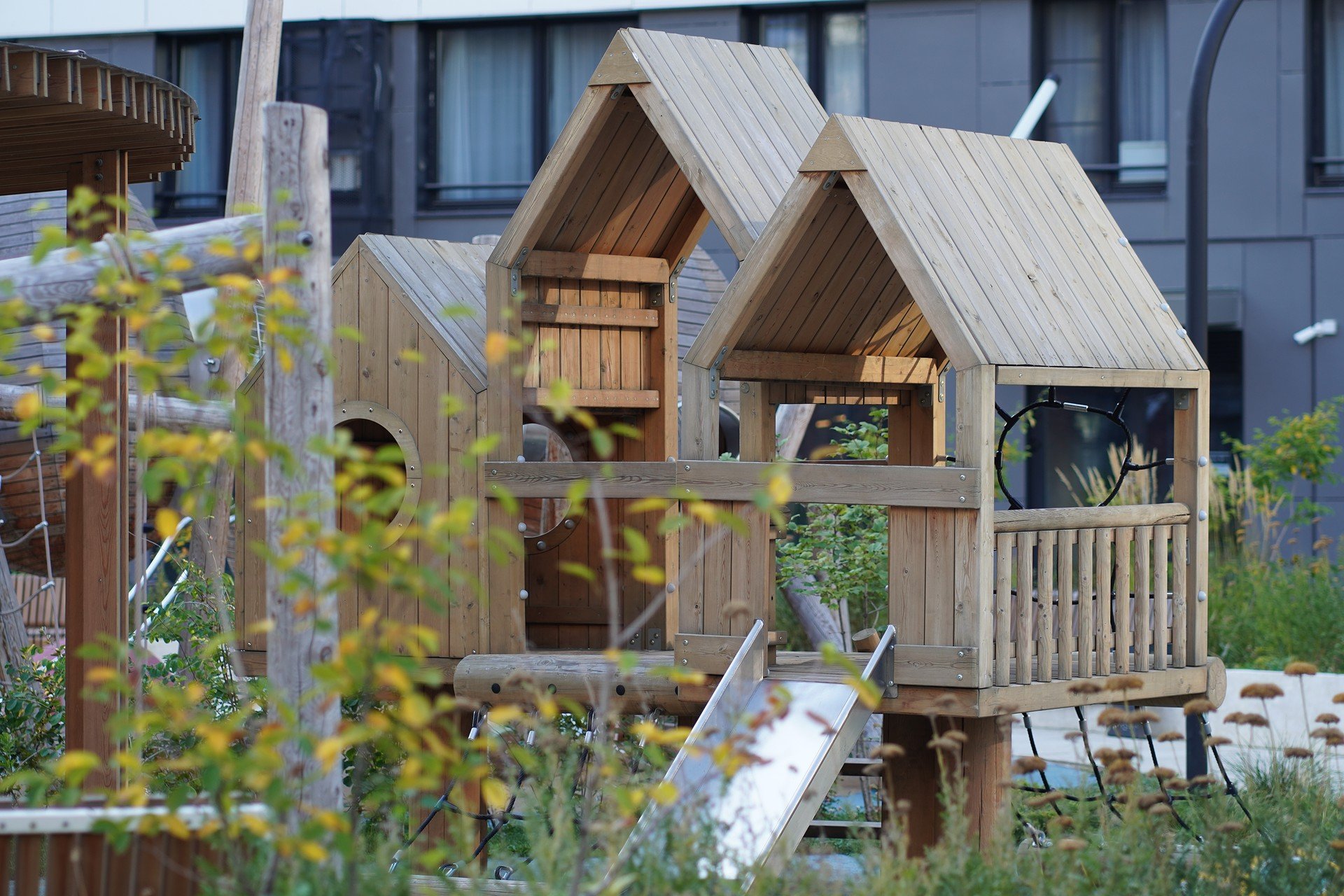 Одна из выразительных деталей двора — игровые домики-скворечники, созданные Лебером по индивидуальному заказу. Они сделаны в стиле Натуральной серии компании и выполнены из прочной сибирской древесины. Её естественная фактура и тёплый оттенок органично дополняют ландшафт, вдохновлённый природными образами и мурмурацией — синхронными полётами птичьих стай.